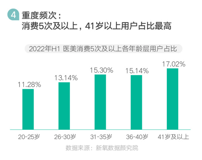 目前20岁—30岁的“熟龄”求美者数量已经几乎可以跟20-25岁的“尝鲜”求美者相匹敌。而很多成名医美医生的主力消费群体年龄段已经固定在35岁到45岁,高频的医美消费更为普遍,新氧平台上医美消费5次及以上的数据也验证了这一论点。2022年H1医美消费5次及以上的用户中,41岁及以上年龄段的用户占比最高,达17.02%,且随着用户年龄的增长,高频医美消费(5次及5次以上)的占比呈直线上升趋势。