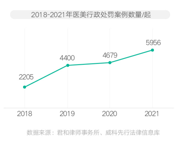 同时,监管部门对于医美行业的执法力度也在不断加大,处罚成本显著上升。在君和律师事务所、威科先行法律信息库公布的行政处罚信息中,以“医疗”+“美容”为关键词检索得出,2019年医美行政处罚案件数量为4400起,约为2018年案件数量的2倍,2020年和2021年的医美行政处罚案件数量分别为4679起和5956起。