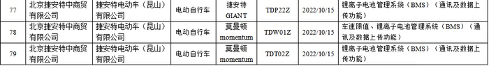 由捷安特电动车(昆山)有限公司生产、北京捷安特中商贸有限公司销售的2批次电动自行车锂离子电池管理系统(BMS)(通讯及数据上传功能)不合格,品牌分别为捷安特GIANT和莫曼顿momentum,生产日期/批号均为2022/10/15,其中1批次规格型号TDP22Z,1批次规格型号TDT02Z;1批次电动自行车车速限值、锂离子电池管理系统(BMS)(通讯及数据上传功能)不合格,品牌为莫曼顿momentum,规格型号TDW01Z,生产日期/批号为2022/10/15。