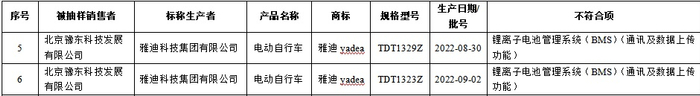 本次抽查发现,北京豫东科技发展有限公司销售、雅迪科技集团有限公司生产的2批次电动自行车锂离子电池管理系统(BMS)(通讯及数据上传功能)不合格,其中1批次规格型号TDT1329Z,生产日期/批号20220830,1批次规格型号TDT1323Z,生产日期/批号20220902。