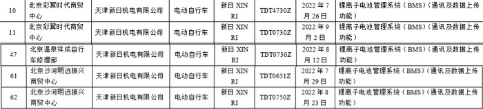 此外,由天津新日机电有限公司生产的5批次电动自行车锂离子电池管理系统(BMS)(通讯及数据上传功能)不合格,分别由北京彩翼时代商贸中心、北京温泉祥成自行车修理部、北京沙河明远振兴商贸中心销售,其中2批次规格型号TDT4730Z,生产日期/批号分别为2022年7月26日和2022年9月2日,1批次规格型号TDT0730Z,生产日期/批号2022年8月12日,1批次规格型号TDT0651Z,生产日期/批号2022年7月29日,1批次规格型号TDT0750Z,生产日期/批号2022年8月23日。