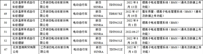 由江苏新日电动车股份有限公司生产的5批次电动自行车锂离子电池管理系统(BMS)(通讯及数据上传功能)不合格,分别由北京温泉祥成自行车修理部北京显朗商贸有限公司销售,其中1批次规格型号TDT9384Z,生产日期/批号为2022年8月13日,1批次规格型号TDR8078Z,生产日期/批号为2022年7月19日,1批次规格型号TDT9381Z ,生产日期/批号为2022-06-27,1批次规格型号TDT9451Z,生产日期/批号为2022年8月26日,1批次规格型号TDT9452Z,生产日期/批号为2022年7月4日;1批次电动自行车锂离子电池管理系统(BMS)不合格,由北京温泉祥成自行车修理部销售,规格型号TDT9423Z ,生产日期/批号为2022年9月1日。