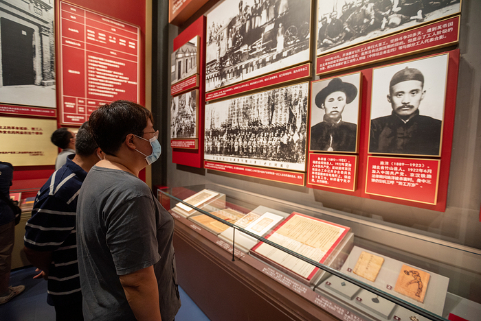 2021年7月18日,北京,观众参观中国共产党历史展览馆展出的“不忘初心牢记使命——中国共产党历史展览”。肖像照片为林祥谦、施洋。