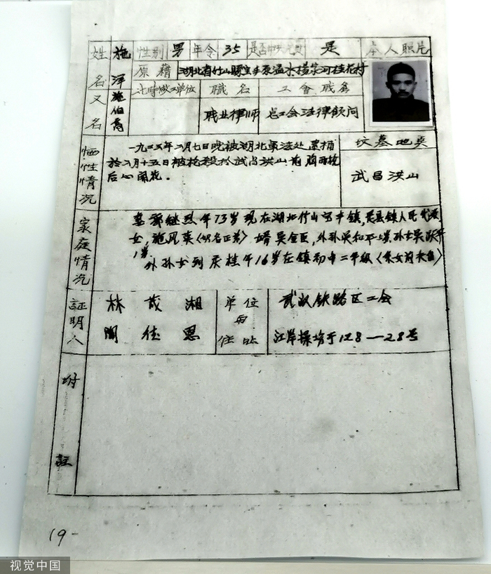 2022年6月17日,武汉,“红旗飘飘——庆祝中国共产党百年华诞湖北红色档案文献展”在湖北省档案馆展出。图为施洋牺牲情况登记表。