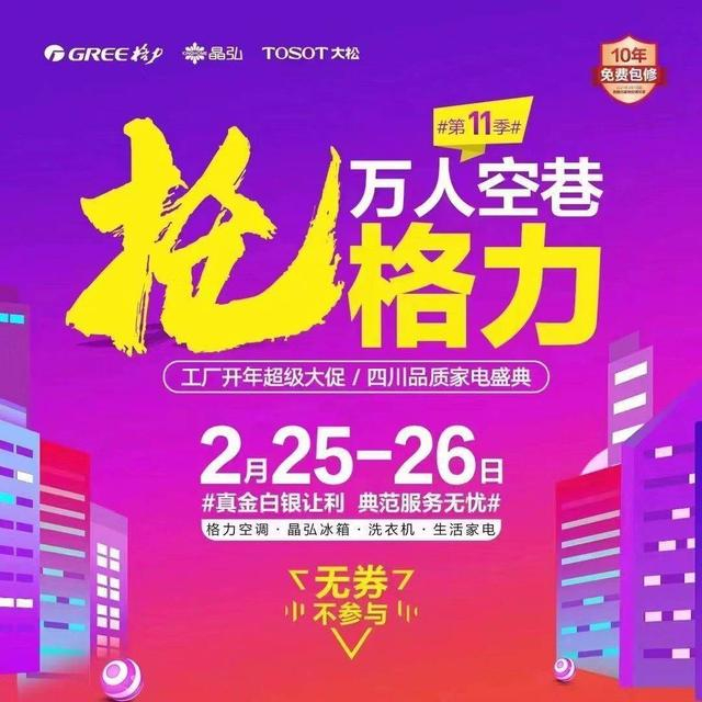 空调“老大”格力在四川的开年大促,依旧是大家熟知的“万人空巷抢格力活动”,时间是2月25至26日。具体内容是2月24日前,认筹50元,抢活动参与资格,并享10重超值权益;同时认筹抵现金,订金十倍翻。此外,满额最高省2000元,套餐最高减1000元,购机送家电,特价抢爆款,并享空调10年免费包修,以及购机抽最高4999元现金大奖好礼。值得一提的是,今年格力的行动不只是聚焦空调,还覆盖冰箱等其他品类。