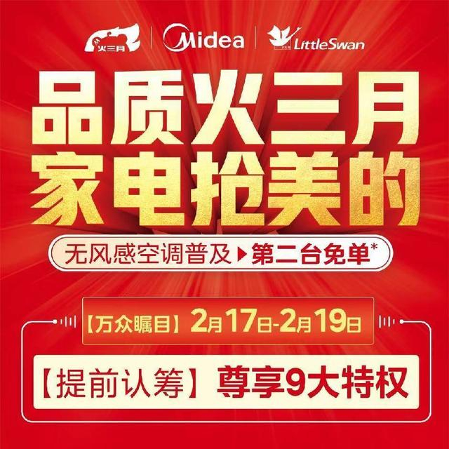 而美的空调今年“火三月”活动锁定2月17日至2月19日,促销力度空前!提前认筹50元 尊享9大权益,并放出多重福利,诸如购多种户型套餐,至高直降万元、新品尝鲜,加量不加价等;同时升级服务,购无风感空调享十免安装、十年保修。