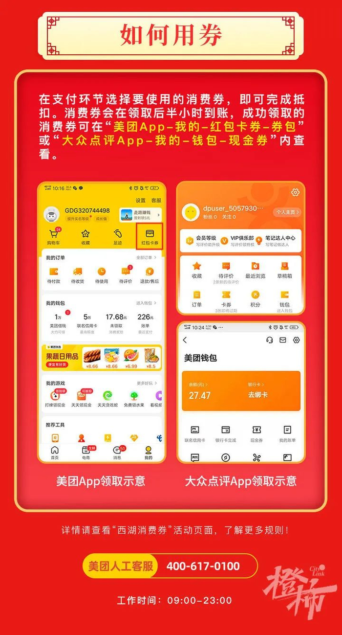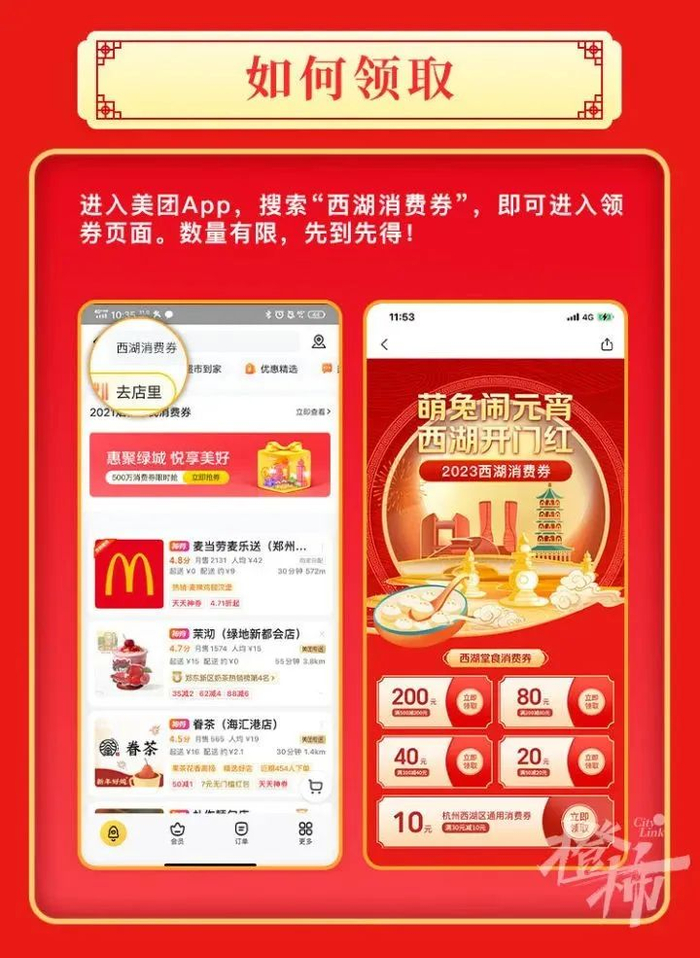 在活动期间(2月16日20:00-2月25日23:59:59),打开美团App,搜索“西湖消费券”即进入活动页面,参与领取电子消费券。