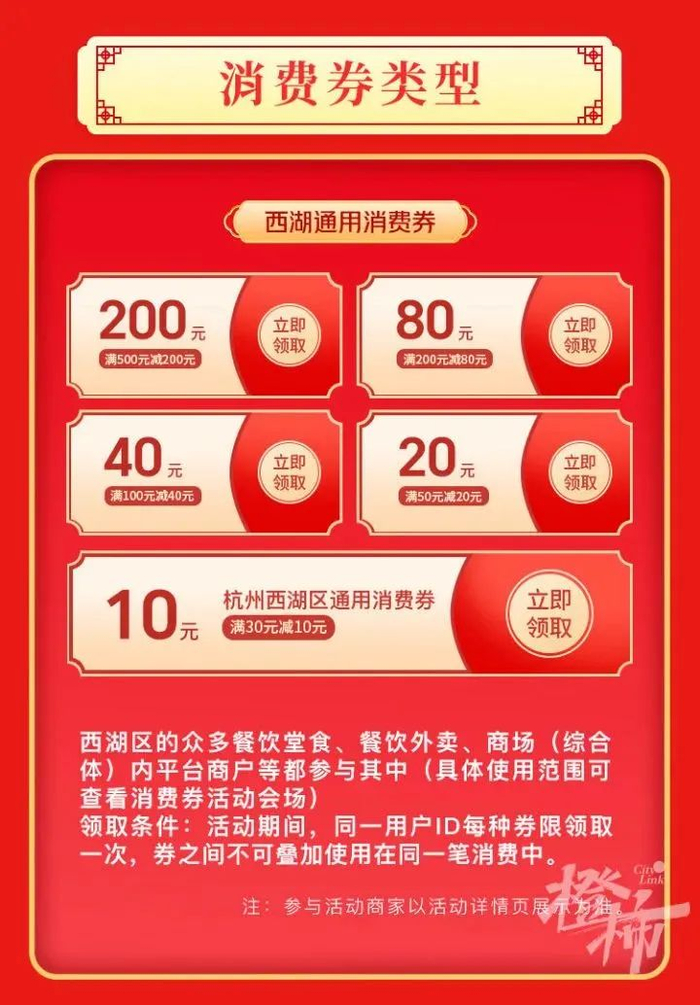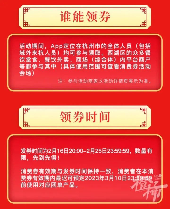 今天(2月16日)20:00,第二轮西湖消费券开抢,最高满500元减200元。