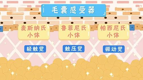感受器们分工明确,给了我们无限的触觉能力。一些感受器会告诉大脑,身体的哪些部位在运动或是如何运动的,一些则能够对皮肤擦伤或抚摸有反应,有的对皮肤的伸展或震动有反应(如卡车驶过或音乐响起时)。还有的对温度很敏感,能区分冷热,再或者是疼痛感受器,让我们对虫咬或受伤有感觉等等。所有的这些信息都由感受器转化为电神经脉冲,神经纤维完全覆盖皮肤,手部的电神经脉冲会沿着脊髓瞬间传递到大脑中处理触觉的区域,在这里解码信息,因此我们才能一瞬间感受到触摸的东西。