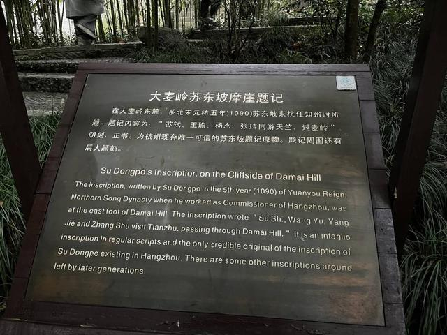 拾阶而上,围栏之旁,伫立着“浙江省级文物保护单位”的石碑。旁边是已经观之模糊的石刻,仔细辨别,题有:“苏轼、王瑜、杨杰、张璹同游天竺,过麦岭”几个大字。这是北宋元祐年间,第二次到杭州任太守的苏轼,留下的“到此一游”,也是目前杭州城内唯一可信的苏轼题记原物。