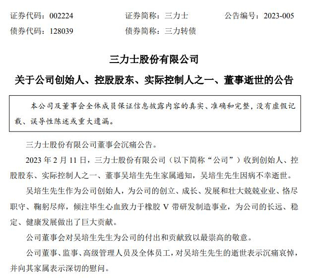 就在一天前,另一浙江上市公司三力士发布公告,公司创始人吴培生因病不幸逝世,享年76岁;