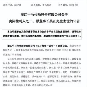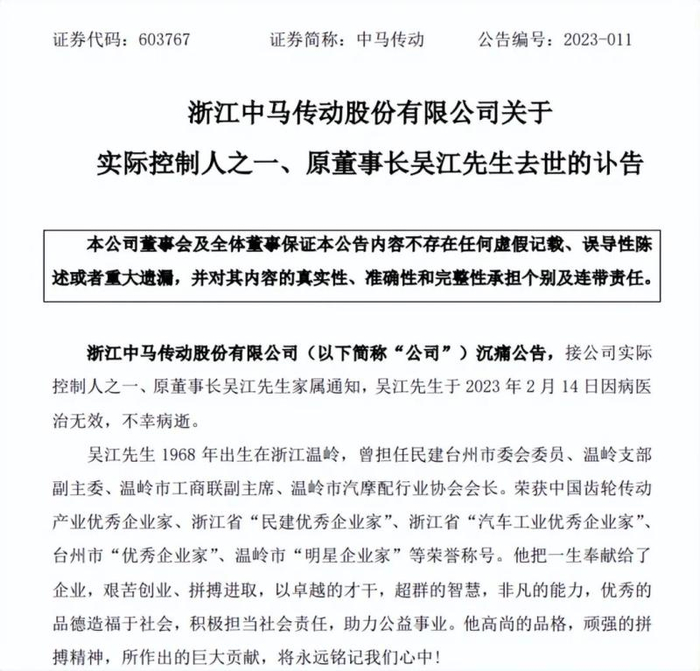 2月14日,浙江上市公司中马传动发布讣告,公司实际控制人之一、原董事长吴江因病医治无效,不幸病逝,年仅55岁;