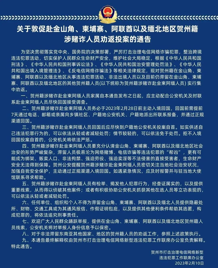 二、百色市右江区籍涉赌诈赴阿联酋、金三角、柬埔寨以及缅北地区人员务必于2023年2月28日前主动入境回国,回国前需提前7天通过电话或亲属向乡镇社区、户籍地公安机关、户籍地派出所联系报备,并通过正规渠道回国。