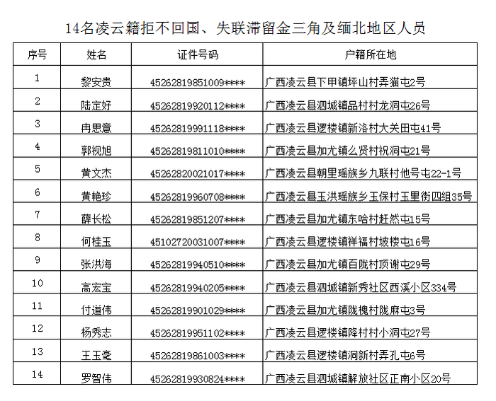 附:18名百色市右江籍拒不回国、失联滞留阿联酋、金三角、柬埔寨以及缅北地区人员名单