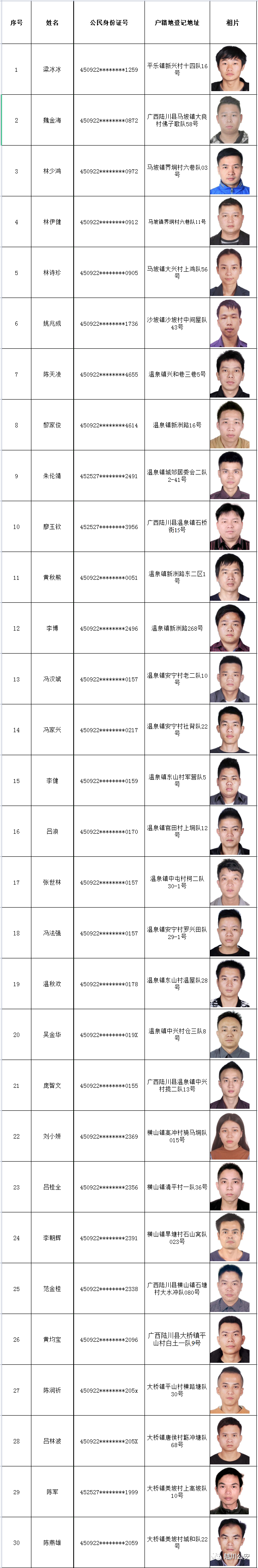 《关于敦促“两卡”违法犯罪人员自首的通告》以及《敦促赴缅北、阿联酋、金三角、柬埔寨地区涉赌诈人员劝返投案的通告》,贺州警方决定对以下人员进行通报,敦促他们尽快投案自首,争取从宽处理!