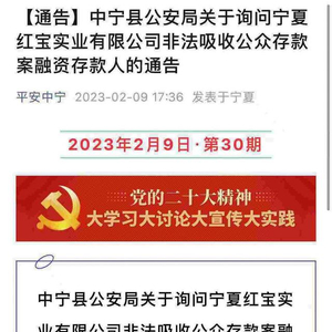 2021年12月7日,宁夏中卫中宁县警方已经对宁夏红宝实业有限公司涉嫌非法吸收公众存款案立案侦查。警方称,2023年2月28日前尽快到中宁县公安局接警中心登记备案。另表示,逾期仍未到公安机关登记备案的,公安机关不再受理,相关法律责任自负。