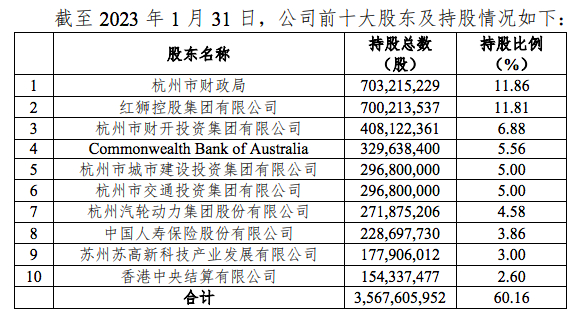 截至2023年1月31日,杭州市财政局及其一致行动人合计持有公司股份1,396,848,384股,占该行普通股总股本的23.55%。八家股东解除一致行动关系后,杭州银行第一大股东为杭州市财政局,持股比例为11.86%,第二大股东为红狮控股集团有限公司,持股比例为11.81%。