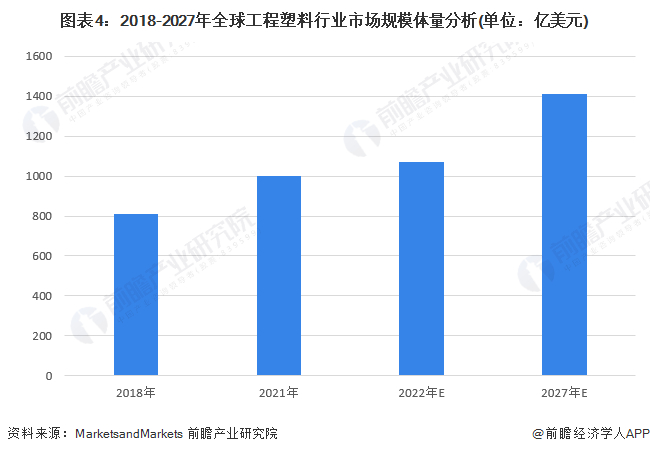 在汽车运输、电气和电子、工业和机械、包装、消费电子等终端消费市场的推动作用下,全球工程塑料市场规模稳步增长。根据MarketsandMarkets机构资料,2022年全球工程塑料市场规模超过1000亿美元,预计2027年市场规模将超过1400亿美元。