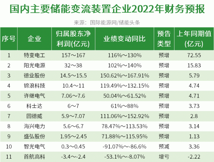 据国际能源网/储能头条统计,国内11家主要储能变流装置企业发布的财务预报中有10家企业2022年业绩预增,占比高达90%以上。