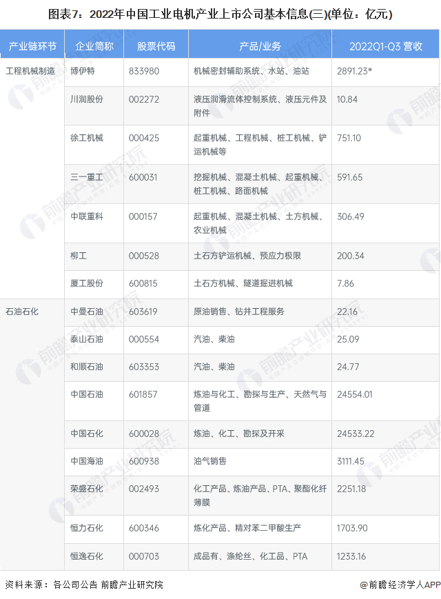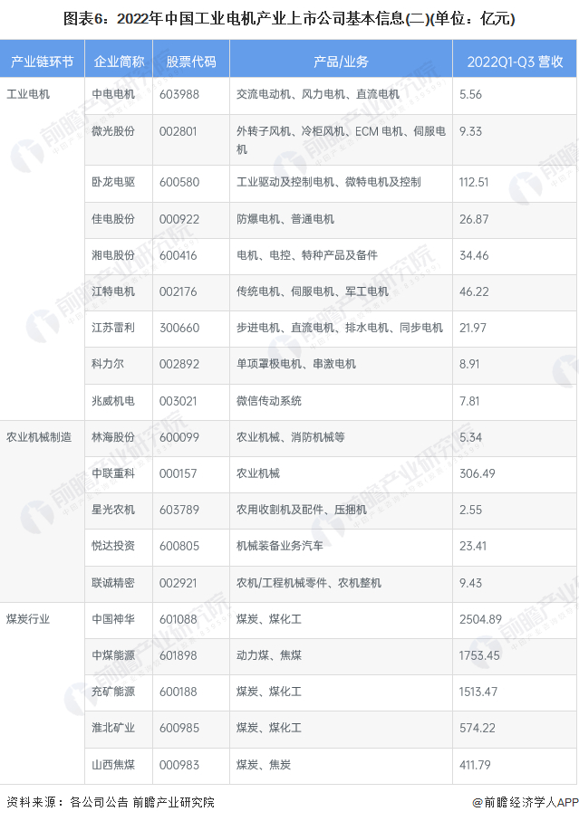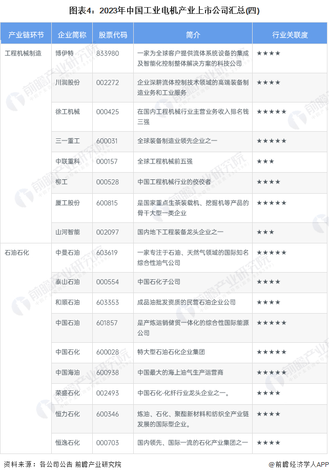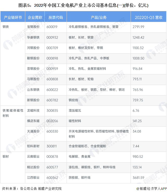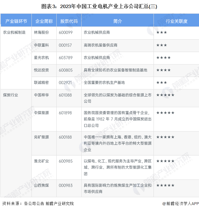 目前,我国工业电机相关产业链中上游产业包括钢铁、磁性材料、铜材,中游工业电机上市企业有卧龙电驱、中电电机等,下游产业包括农业机械、工程机械、煤炭、石油石化行业等,工业电机是工业应用中重要的动力来源。其中产业链各个环节具体上市公司包括: