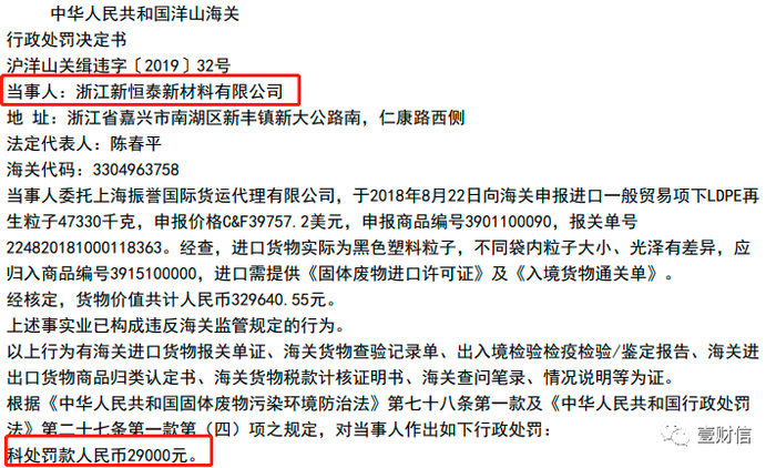 2019年3月29日和6月27日,新恒泰再次因进口货物申报与实际不符以及进口限制进口类固体废物分别被处罚人民币2.90万元、1.30万元。