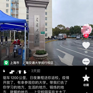“驱车1200公里,日夜兼程送你返校。疫情开放了,有幸参观你的大学,去了你学习的地方,生活的地方,锻炼的地方,就餐的地方……加油,这学期要更加努力,期待你有所成就。”2月12日,一位上海交大的学生家长在社交平台上发布了一则视频,激动地讲述参观孩子学校的心情。