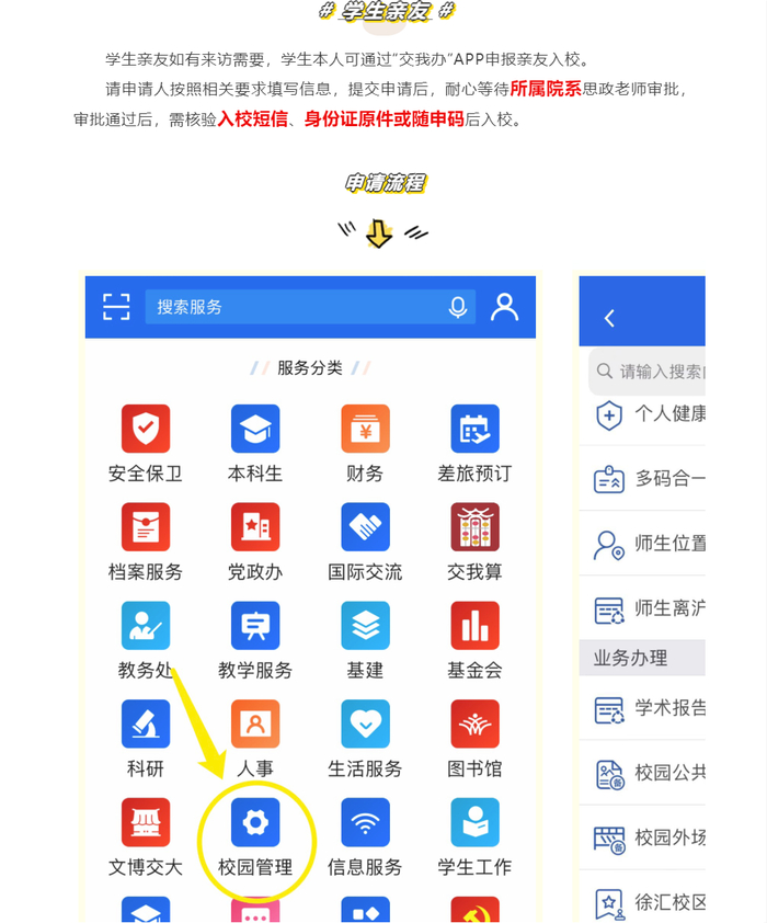 该微信推文详细介绍了申请操作,显示学生亲友如有来访需要,学生本人可通过“交我办”APP申报亲友入校,经申请人所属院系思政老师审批通过,相关人员核验入校短信、身份证原件或随申码后可入校;包括教职工亲友、校友等在内的校外人员如有入校工作需要,则由学校二级单位代为申请,入校核验标准同前。