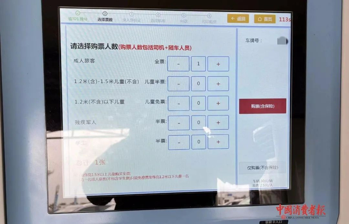 李先生说,当时乘船过海的人很多,每个自动购票机前都排了不少人。他购票时按程序要求一步步填写,进入支付环节时看到,在页面右中间处一条大红框,反白字“购票(含保险)”字样很显眼,以为是系统提醒乘客票中含有保险,没有多想就按键支付。