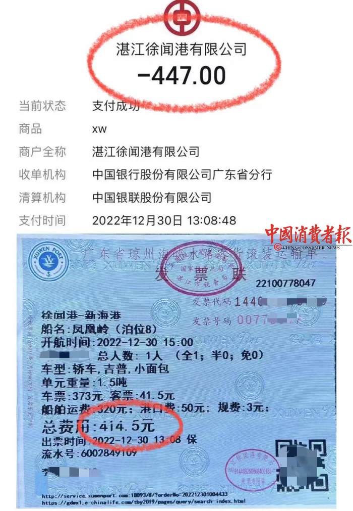 据李先生介绍,2022年12月30日下午,他驾车准备从广东湛江徐闻港口过琼州海峡到海南省海口市。车辆需要船舶运输到对岸,除购买客票外还要购买车票。