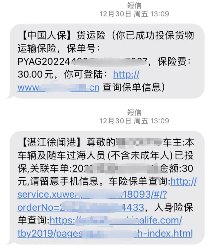 李先生只收到湛江徐闻港有限公司发送的投保通知短信,其中有人身险保单查询链接。但李先生没有保单凭证号,点开链接只有保险公司页面,无法看到自己的保单,也未表明保险费的金额。