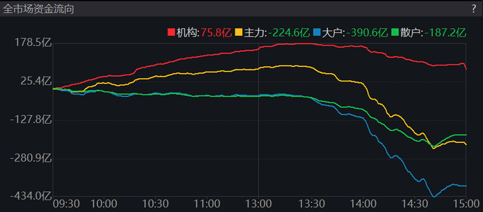 Wind市场资金流向显示,2月16日,仅有机构(挂单额大于100万元)做多,主力(挂单额在20万元到100万元之间)、大户(挂单额在4万元到20万元之间)、散户(挂单额小于4万元)均在午后夺路而逃。其中,大户、主力、散户分别流出390.6亿元、224.6亿元、187.2亿元。