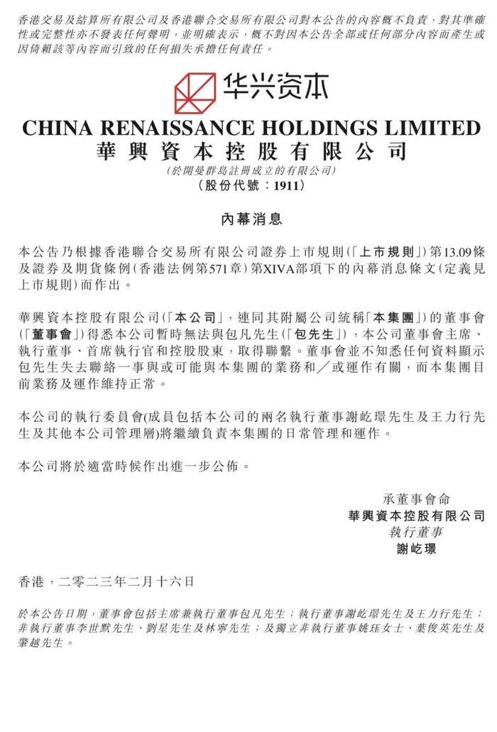 2月16日晚间,华兴资本控股公告称,暂时无法与公司董事会主席、首席执行官和控股股东包凡取得联系。目前公司经营一切正常,并将于适当时机作出进一步公告。