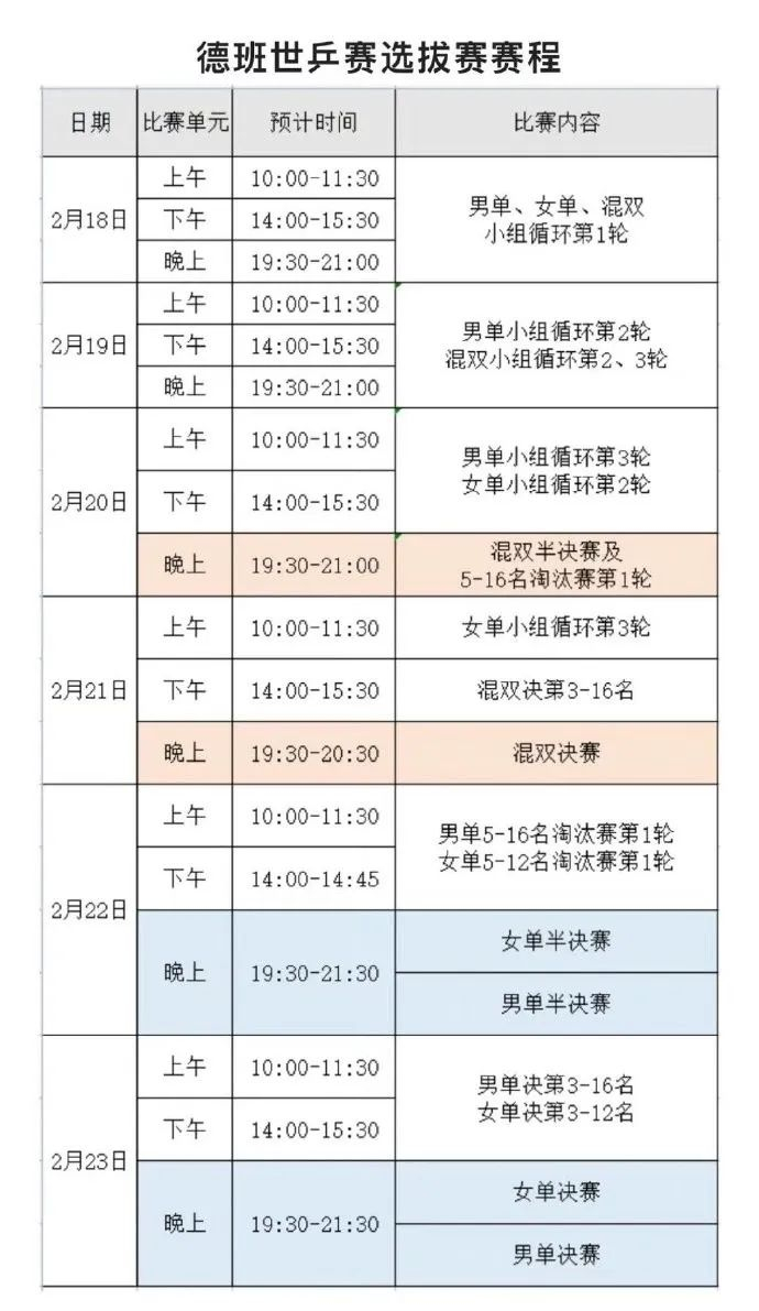 德班世乒赛选拔赛赛程