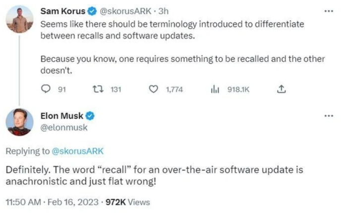 与此前特斯拉的多次召回一样,此次召回并不要求受影响车辆的车主前往经销商,仅通过无线软件更新即可解决。因此马斯克对NHTSA称之为“召回”感到不满,建议NHTSA应与时俱进,并停止将这些OTA软件更新称为“召回”,因为它们实际上并不是物理层面的召回。在这种情况下使用“召回”一词还容易给车主带来不必要的心理压力,并且影响品牌声誉,因为大多数阅读新闻的读者会认为特斯拉实际上是在召回110万辆汽车以更换故障零部件。