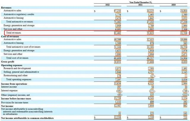文件显示,2022年特斯拉总营收814.62亿美元,同比增长51%,其中,汽车销售营收672.10亿元,同比增长52%。