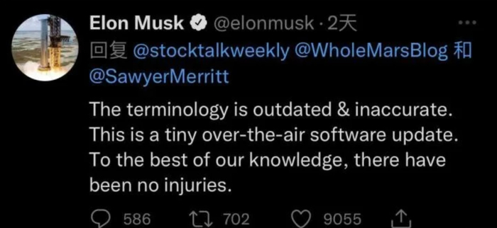 针对此事件,马斯克在推特上表示:“NHTSA的术语已经过时且不准确。这只是一个微小的软件更新。据我们所知,没有人因此受伤。”