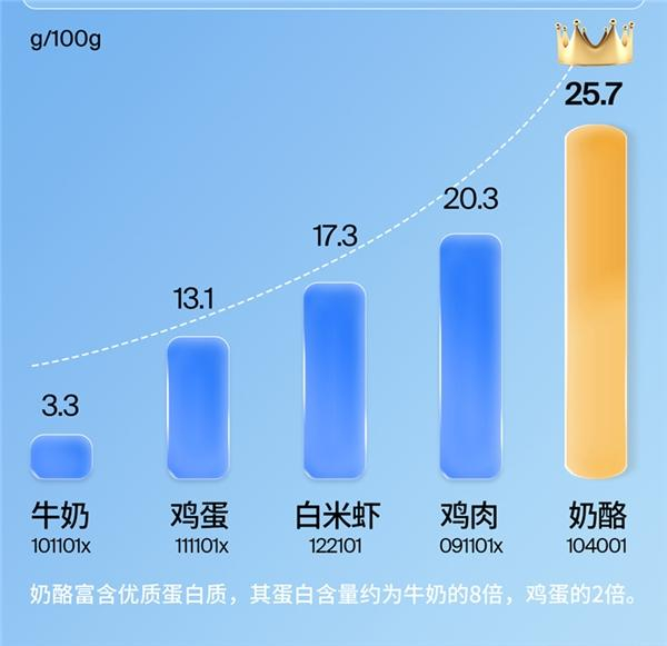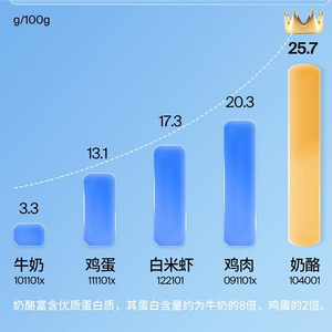 日常生活中注意饮食均衡营养,多摄入优质蛋白,增强自护力对身体健康十分有益。奶酪的蛋白质含量具有非常显著的优势。根据《中国食物成分表第6版》中各食物中蛋白质含量的对比结果来看,奶酪中蛋白质的含量是牛奶的8倍,鸡蛋的2倍。因此,越来越多人选择富含优质蛋白的奶酪来补充蛋白营养,也为一日三餐增添更丰富的风味。
