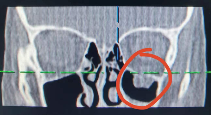 小川的眼部CT结果显示,他的眶骨骨折后完全断裂的骨片夹住了下直肌,造成眼球转动障碍,这正是造成小川眼球无法正常转动,产生斜视的原因。