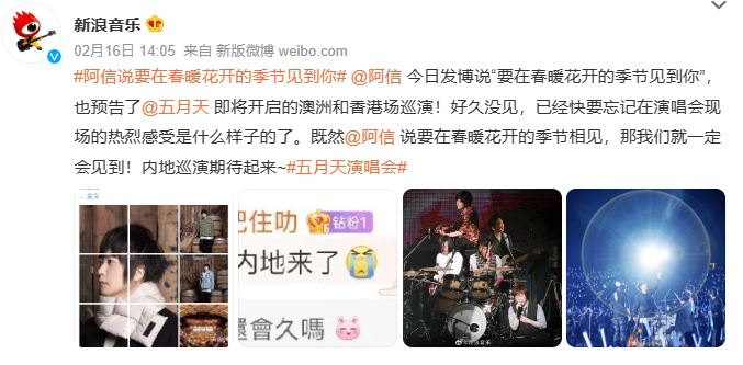 而近日,五月天已经率先开唱!2月11日,五月天带着《好好好想见到你》演唱会前往马来西亚,与4万名歌迷相见。如果一切顺利,五月天的演唱会,将陆陆续续来到中国内地城市。