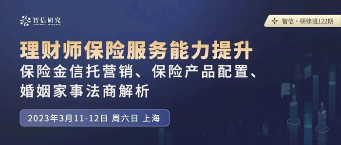 鉴于此,2023年3月11日-12日(周六、周日),智信将在上海举行主题为理财师保险服务能力提升:保险金信托营销、保险产品配置、婚姻家事法商解析的线下资管业务研修班。