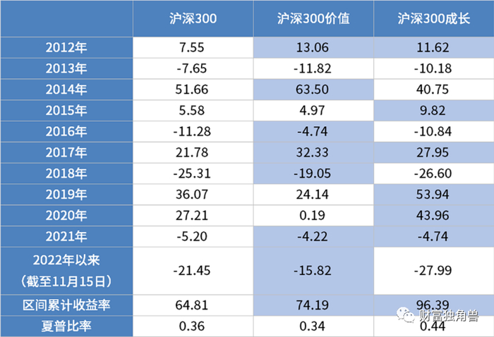 沪深300指数及沪深300价值、沪深300成长策略指数收益率对比(%)
