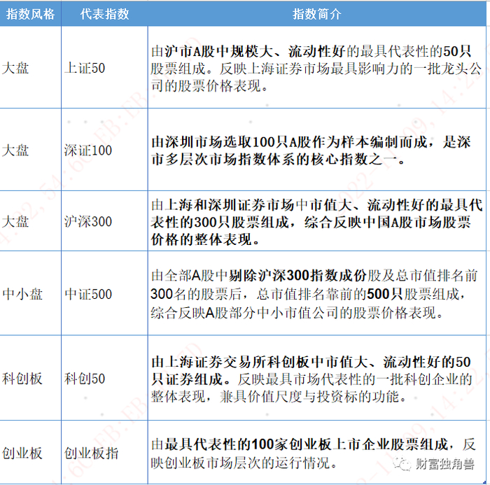 例如按照不同宽基指数样本公司流通市值大小来进行分类,那么上证50、沪深300为大盘类宽基指数,中证500和中证1000则分别是中、小盘类宽基指数;如果按照样本股的成长与价值风格来进行分类,又可以分为价值型和成长型等,上证50和创业板指数分别就是典型的价值风格和成长风格宽基指数。