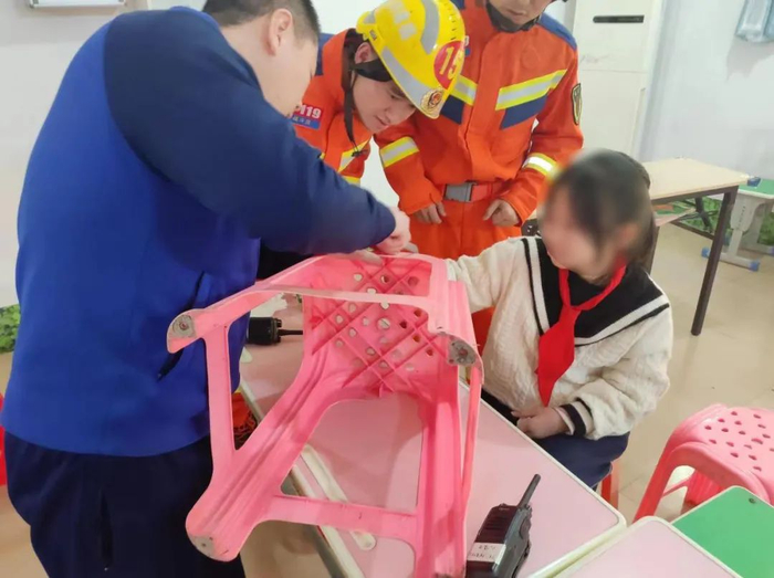 据了解,该小学生读五年级,中午在午托班写作业间隙,玩耍时不小心将手指插进凳子孔洞被卡。