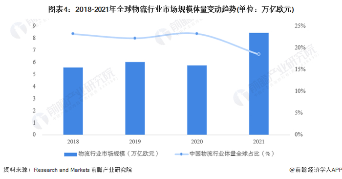 根据Research and Markets统计数据,2018-2021年全球物流行业市场体量呈现波动上升趋势,其中2018-2020年中国物流行业占全球比重维持在22%以上,2021年中国物流行业占比有所下降,达到18.5%,全球物流行业总体规模达到8.43万亿欧元。