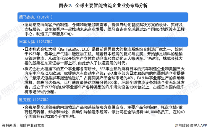 全球智能物流行业供给稳步增长,领先企业“马太效应”明显,其中大部分成立时间较久,基于其自身在某一品类或某一应用行业的深耕,在不断进行技术投入同时,通过收购、并购等方式不断拓展业务,持续丰富产品线与下游应用行业。