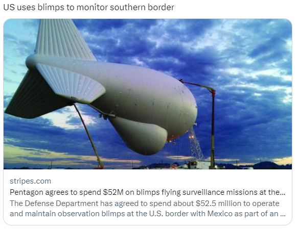 另据美国军事网站“stripes”2022年1月报道,美国国防部已经同意花费大约5250万美元,在美墨边境运行和维护执行监视任务的飞艇,这是美国在该地区持续执行的任务的一部分。