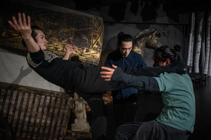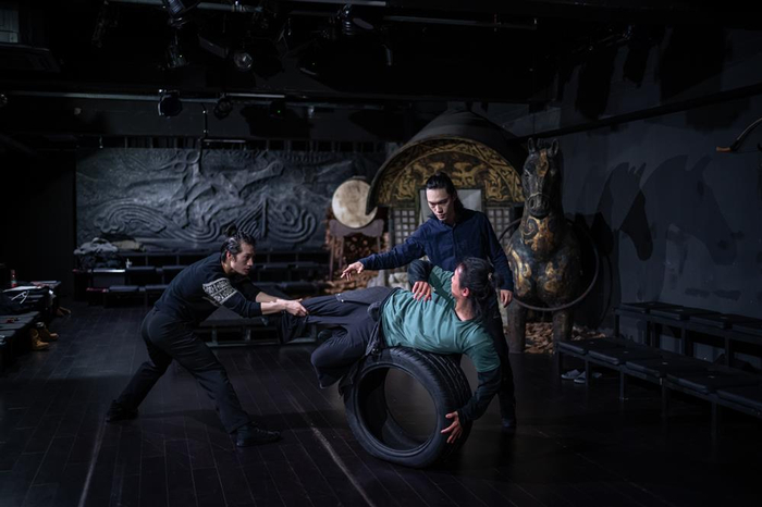 在逼仄的空间里完成高难度的打斗动作,对演员们来说是极大的考验。扮演“王”的舞者上官俊雄说,“《寅时说》的危险系数很高。一个跳转翻,如果从观众眼前掠过,观众会惊叹舞者精准的控制力,如果啪地打到观众脸上,就酿成了事故,绝不被允许。而且剧中有许多道具,比如弓箭、轮胎、箱子,需要大量训练,也极其考验舞者之间的配合度。”