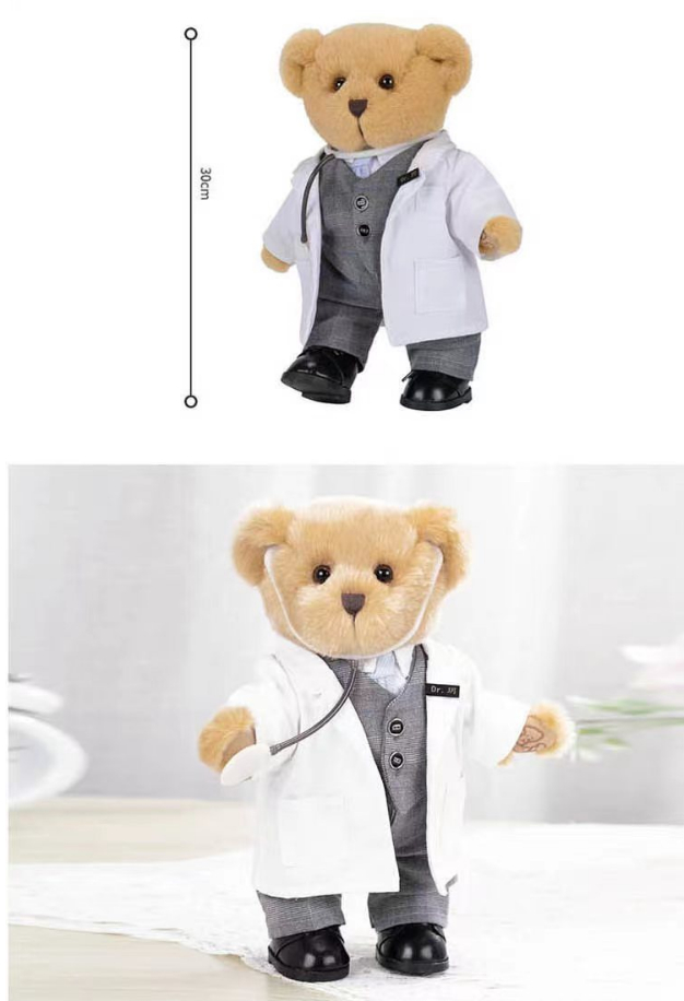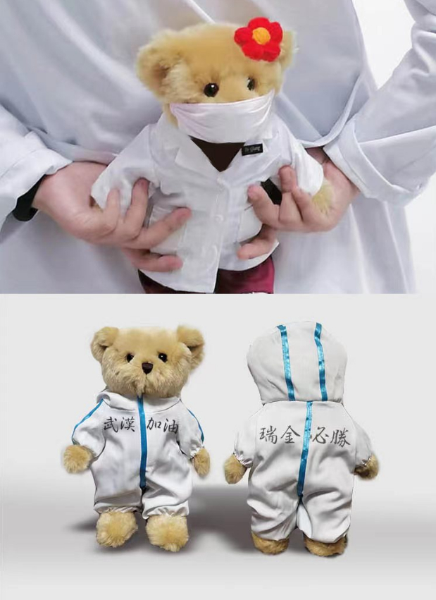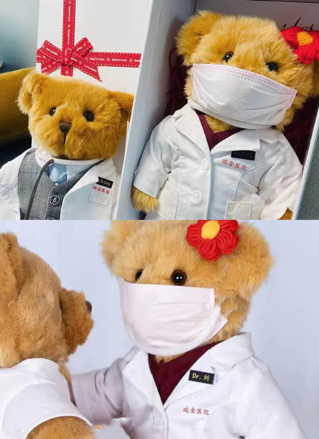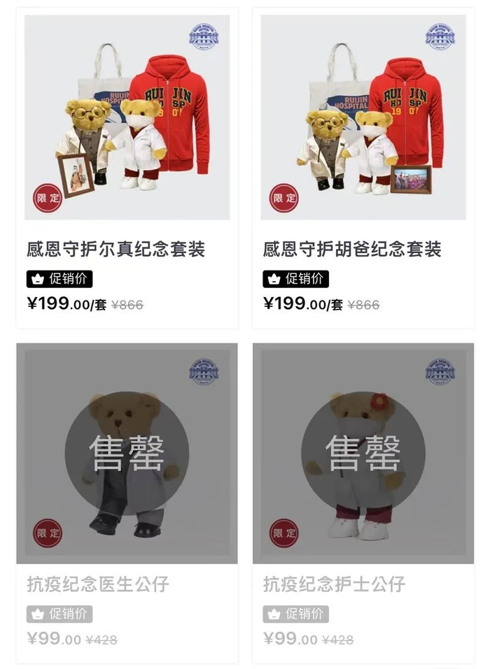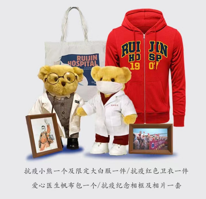 除了最先售罄的“抗疫纪念医生公仔”——穿着白大褂的小熊玩偶,包含该元素和卫衣、帆布袋、纪念相框的两个特别套装更是在上架后秒杀。“感恩守护”系列的纪念套装分别以瑞金医院副院长陈尔真、胡伟国为主题,2020年,他们带领的援鄂医疗队返沪前夕,一对卡车司机夫妇驱车十余个小时,将满载着感激之情的小熊玩偶送至医疗队下榻的酒店。