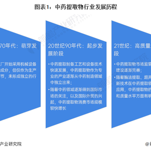 几千年来,传统中药主要是直接用原药材或饮片配成复方,由病人自己制备汤剂服用,这种传统用药方法的缺点是服用不方便、疗效不稳定、质量无法控制等;进入20世纪70年代,提取物成为中药市场上的一种新的产品形态,部分中药厂开始采用机械设备提取植物成分,但仅作为生产的一个环节,未形成独立的行业;随着国际社会对中药的关注度逐渐提升,以及我国对外贸易的兴起,20世纪90年代,我国中药提取物行业进入起步时期;到21世纪,随着更先进的中药材提取技术如酶法提取、超声提取等技术采用,中药材提取效率得到极大提升,我国的中药提取物行业进入规范化、高质量发展阶段。