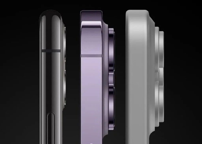 iPhone 11 Pro、iPhone 14 Pro、iPhone 15 Pro 摄像头突出程度对比。